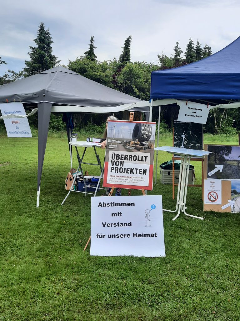 Protestaktion bei der Tennet Infoveranstaltung auf der Dorfgemeinschaftsanlage Bockhornerfeld im Juni 2025